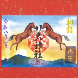 雪の結晶や雪うさぎで冬を表現し、令和8年の干支「午うま」をパンジーや椿、松竹梅の判子で色彩豊かに大きく描きました。当神社の別称「北天王」を色筆で書き入れします。