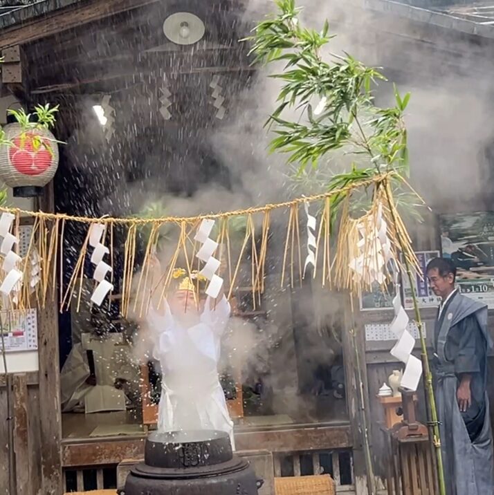 御供祭に続き、秋の湯立神事が執り行われ、米、神酒、塩が注がれた熱湯に笹の葉を浸し、大きく飛ばして邪気を祓います。