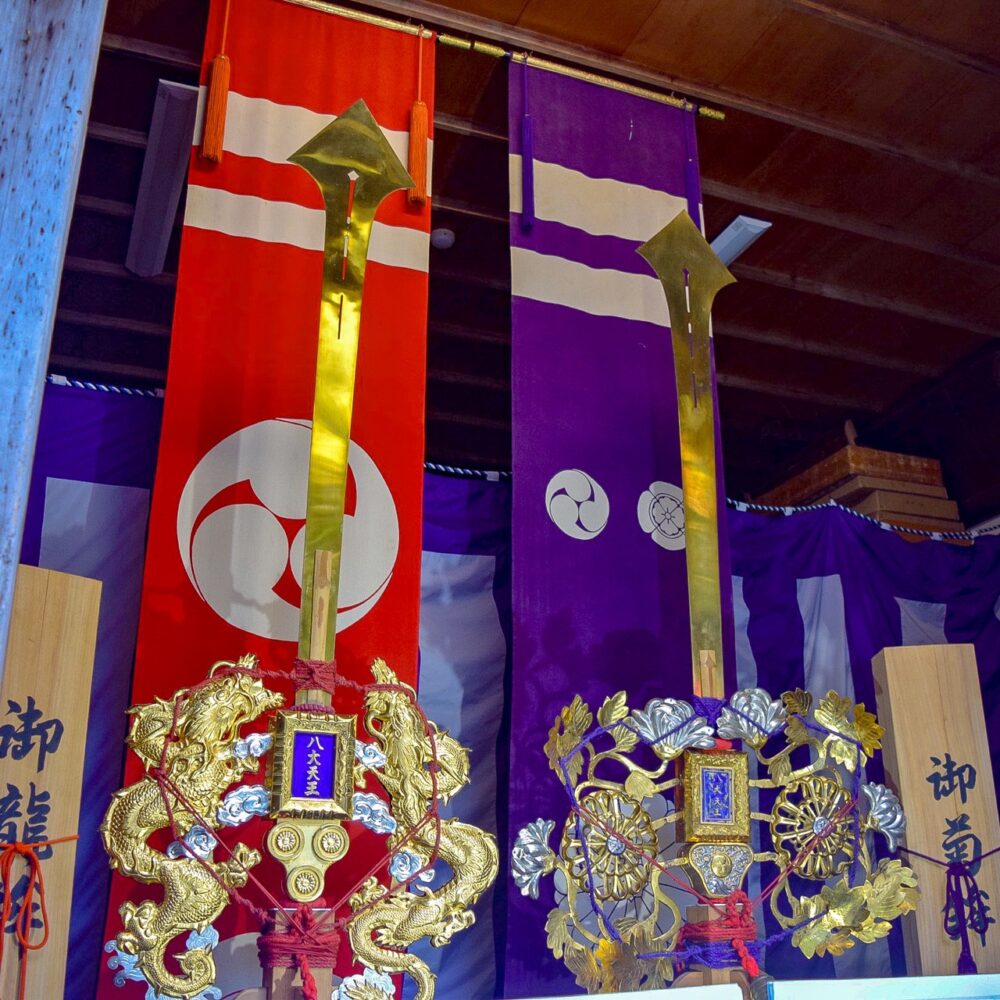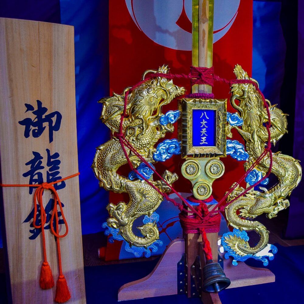 八大神社では5月5日に行われる氏子祭(大祭)にて、菊鉾、龍鉾、柏鉾の3基が差し手の卓越した技術により、剣を前後にまねかせ鈴の音を響かせ進みます。今回の展示ではそのうちの龍鉾、菊鉾の二基を展示しています。