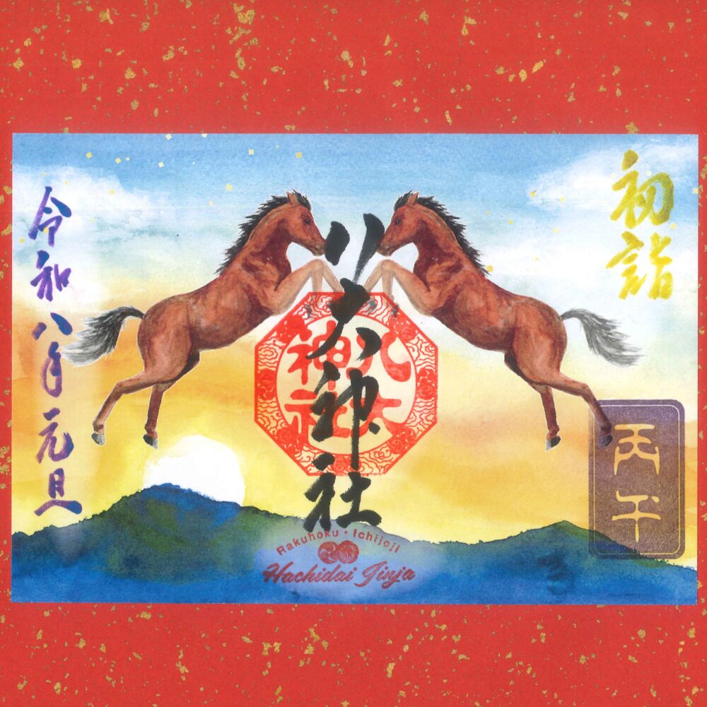 ・1月の月替り御朱印は干支『午うま』を大胆に描き、新年を寿ぎ見開きサイズで奉製しました。飛躍する二頭の午で八大神社の『八』と令和『八』年をイメージした形になっており、背景には比叡山・東山から昇る初日の出を表現しています。