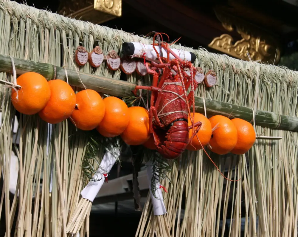 ・伊勢海老は長寿、みかんは「にこにこ なかむつまじく」(左右に2個、中に6個)等の云われがあります。