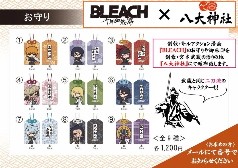 BLEACHは刀を武器に戦うアニメということで、八大神社にゆかりのある剣豪・宮本武蔵と共通点があります。そしてキャラクターの中には武蔵と同じ二刀流の人物もいるそうです。